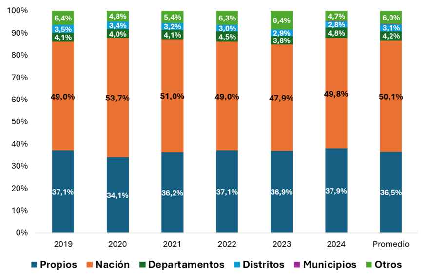 Composición de ingresos de universidades públicas por fuente de financiación, 2019-2024