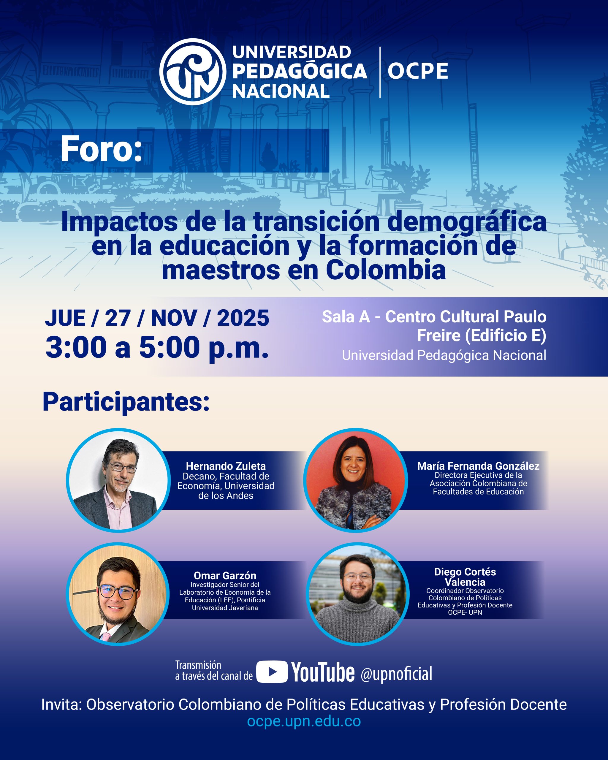 El Observatorio Colombiano de Políticas Educativas y Profesión Docente (OCPE) de la Universidad Pedagógica Nacional invita a la comunidad académica, investigadores y profesionales del sector educativo a participar en el foro “Impactos de la transición demográfica en la educación y la formación de maestros en Colombia”, un espacio de reflexión sobre uno de los retos estructurales más significativos del sistema educativo nacional.